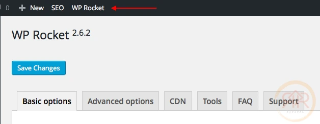 Buka panel plugin dengan mengklik menu WP Rocket di bagian atas dasbor WordPress Anda.