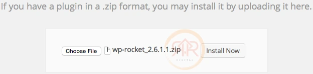 Klik Pilih File dan pilih wp-rocket.zip dari folder Unduhan komputer Anda. Klik Instal Now.